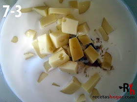 - Mientras pasan esos 15 min. picamos el queso en cuadrados pequeñitos, cogemos un caldero (olla) ponemos la nata, el queso y los 5 ml. de Jerez. Removemos hasta que se haya derretido completamente el queso y se haya formado una crema.